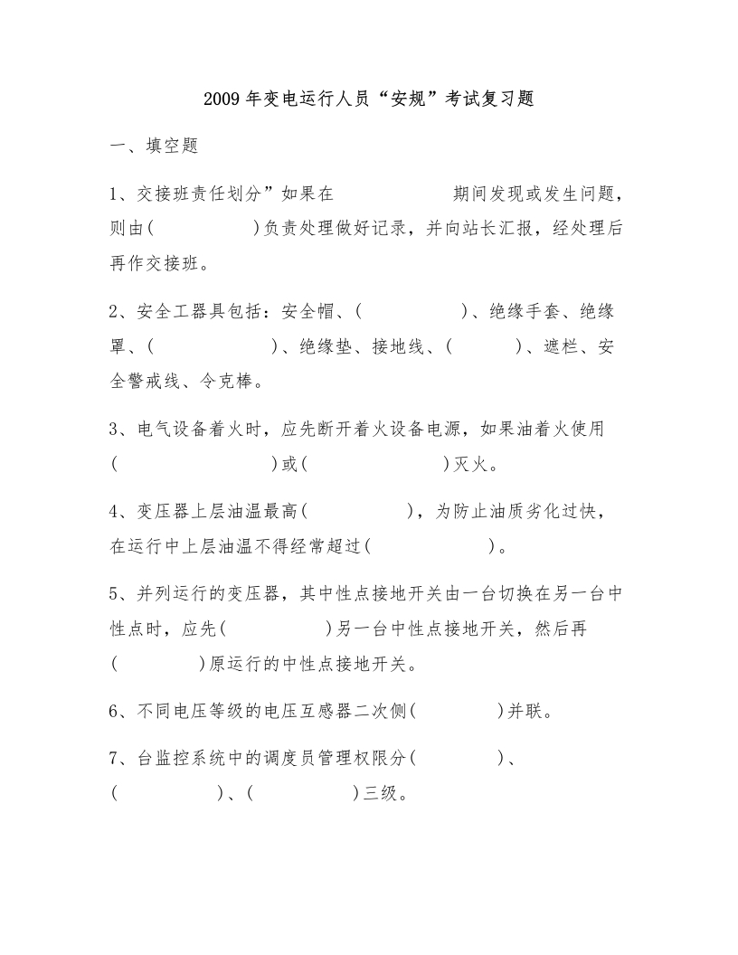 2009年变电运行人员“安规”考试复习题