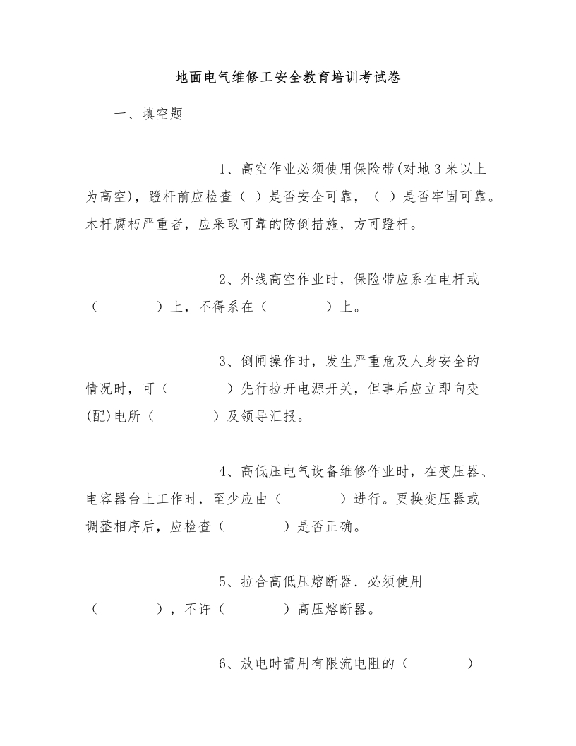 地面电气维修工安全教育培训考试卷