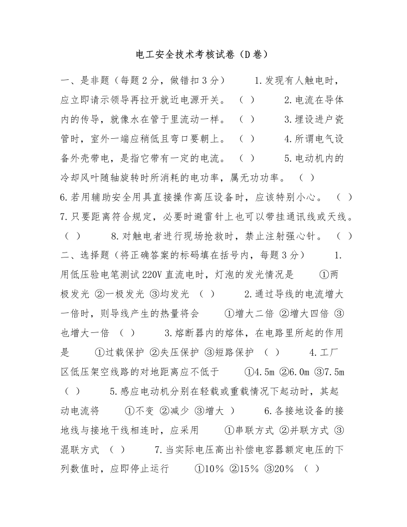 电工安全技术考核试卷(D卷)