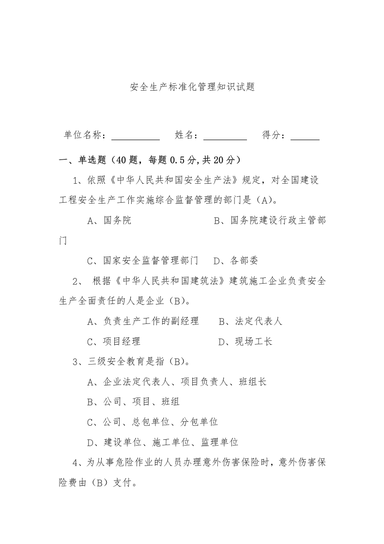 安全生产标准化管理知识试题