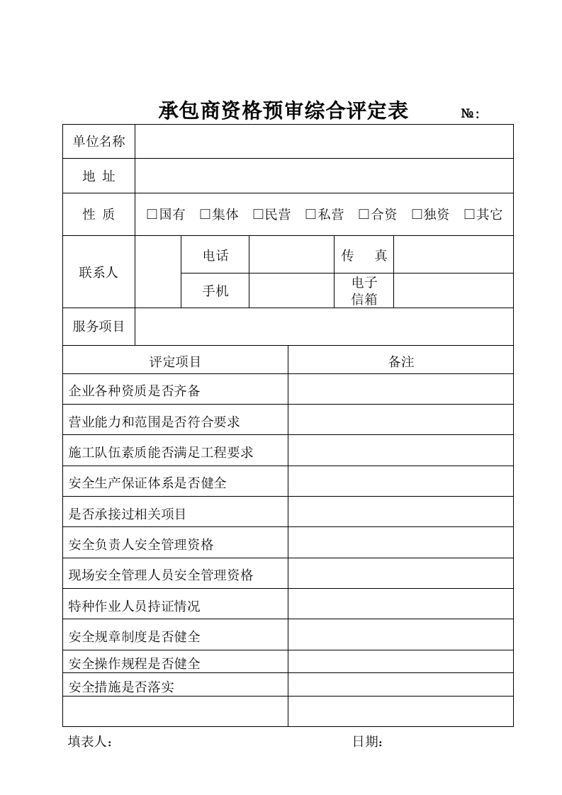 承包商资格预审综合评定表