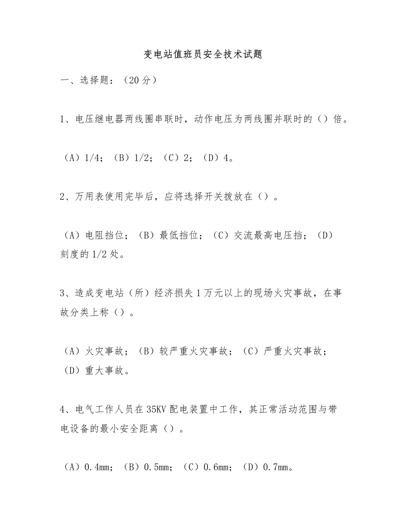 变电站值班员安全技术试题