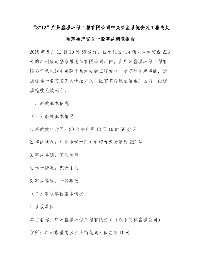 “8•12”广州盛璟环保工程有限公司中央除尘系统安装工程高处坠落生产安全一般事故调查报告
