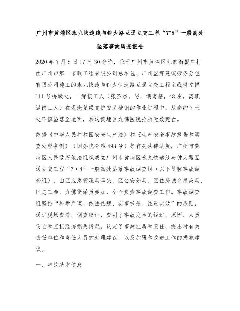 广州市黄埔区永九快速线与钟太路互通立交工程“7•8”一般高处坠落事故调查报告