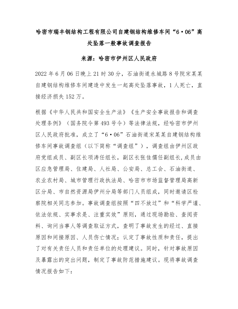 哈密市瑞丰钢结构工程有限公司自建钢结构维修车间“6·06”高处坠落一般事故调查报告