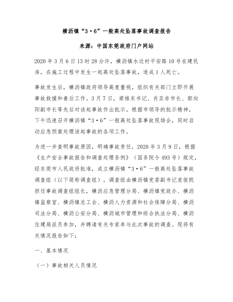 横沥镇“3·6”一般高处坠落事故调查报告