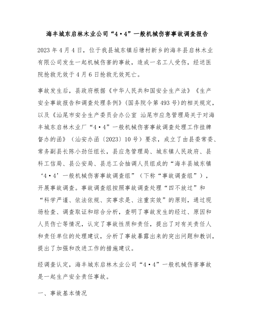 海丰城东启林木业公司“4·4”一般机械伤害事故调查报告