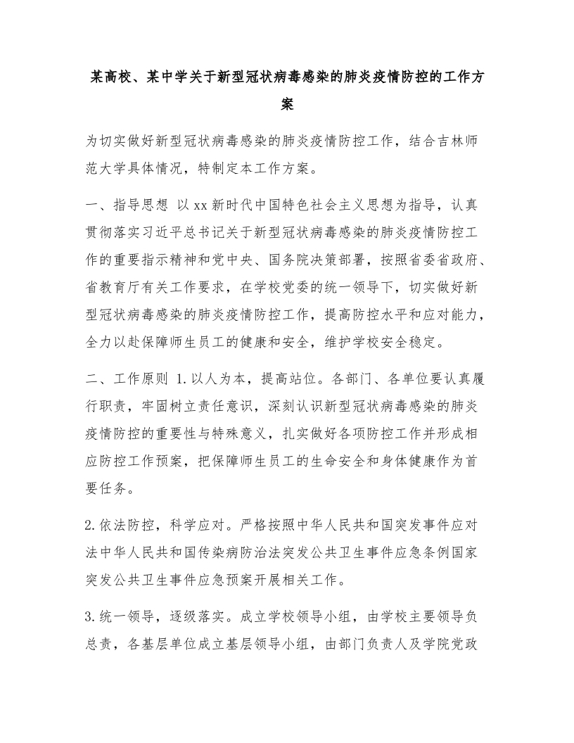 某高校、某中学关于新型冠状病毒感染的肺炎疫情防控的工作方案