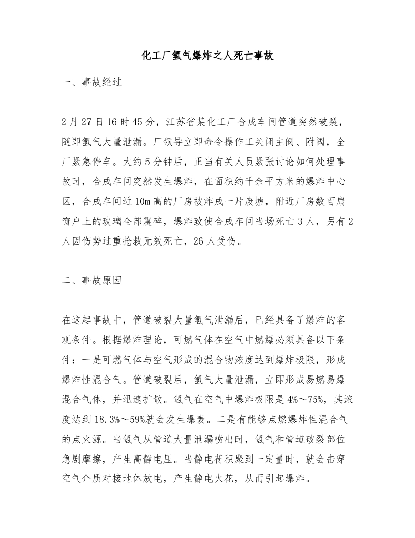 化工厂氢气爆炸之人死亡事故