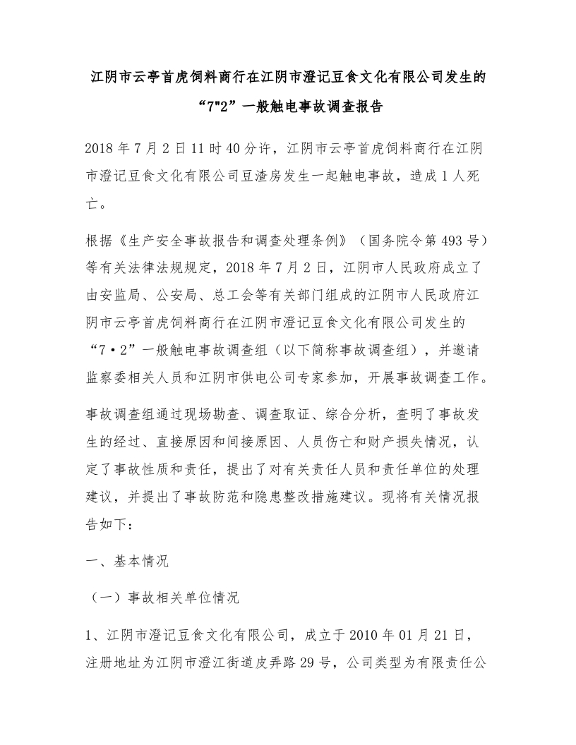 江阴市云亭首虎饲料商行在江阴市澄记豆食文化有限公司发生的“7•2”一般触电事故调查报告