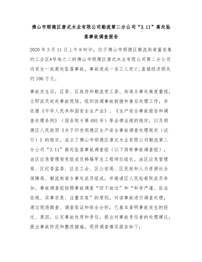 佛山市顺德区唐式木业有限公司勒流第二分公司“3.11”高处坠落事故调查报告