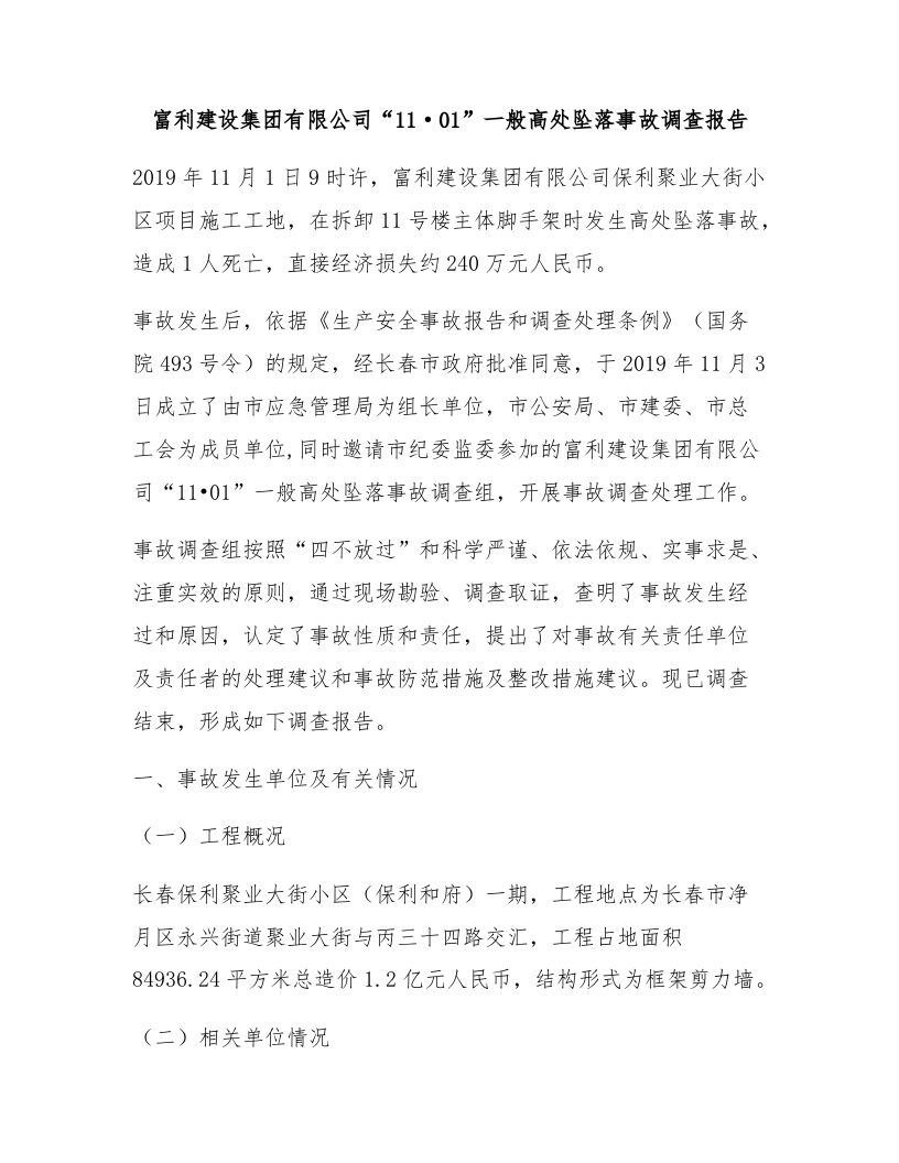 富利建设集团有限公司“11·01”一般高处坠落事故调查报告