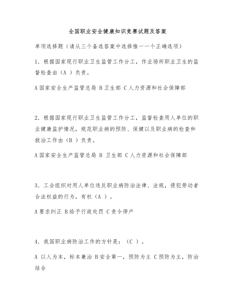 首页安全题库职业卫生试题全国职业安全健康知识竞赛试题及答案