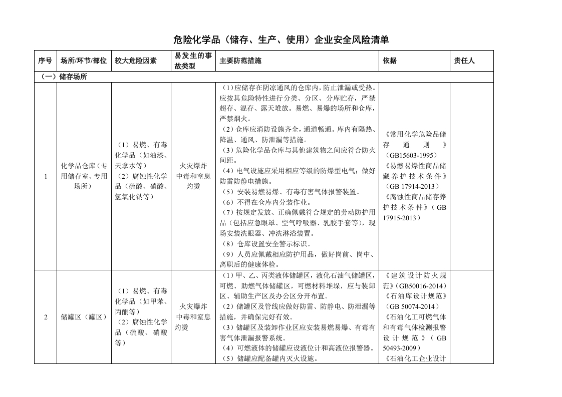 危险化学品(储存、生产、使用)企业安全风险辨识分级管控清单