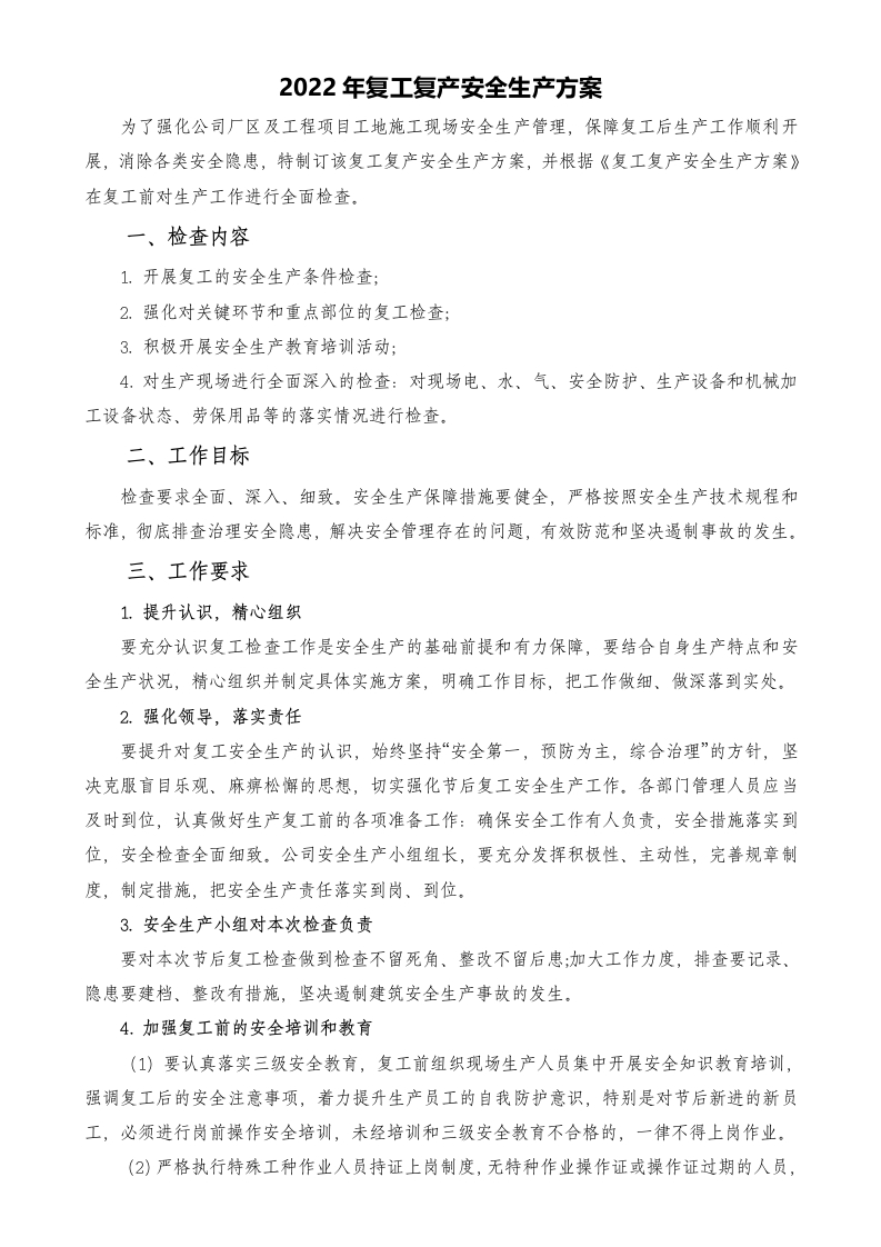 复工复产安全生产工作方案
