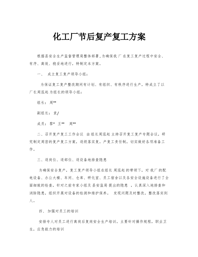 化工厂节后复产复工方案