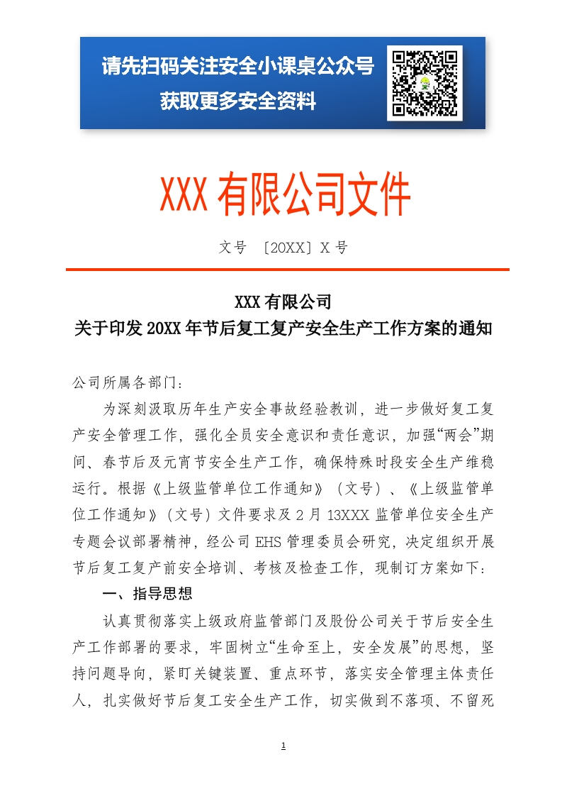 首页安全课件节后复工年企业通用复工复产工作方案-红头文件