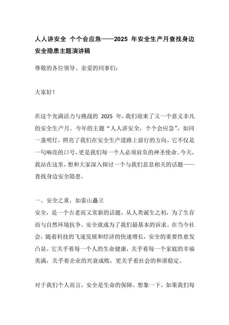 人人讲安全 个个会应急——2025 年安全生产月查找身边安全隐患主题演讲稿