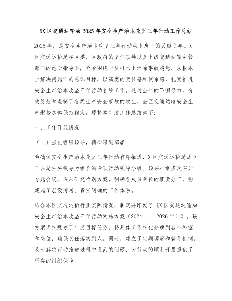 首页安全文档综合XX区交通运输局2025年安全生产治本攻坚三年行动工作总结