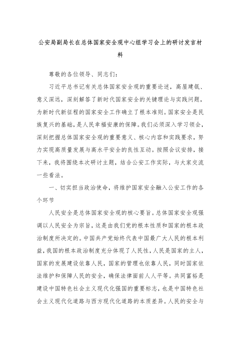 公安局副局长在总体国家安全观中心组学习会上的研讨发言材料