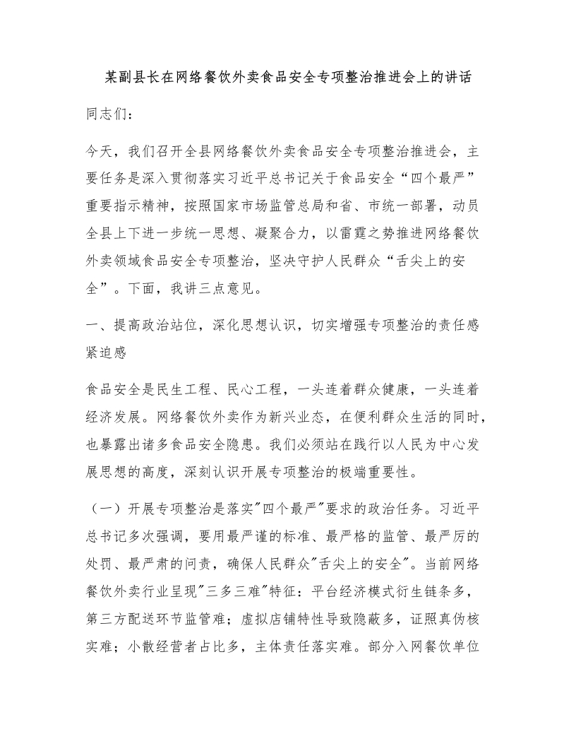 某副县长在网络餐饮外卖食品安全专项整治推进会上的讲话