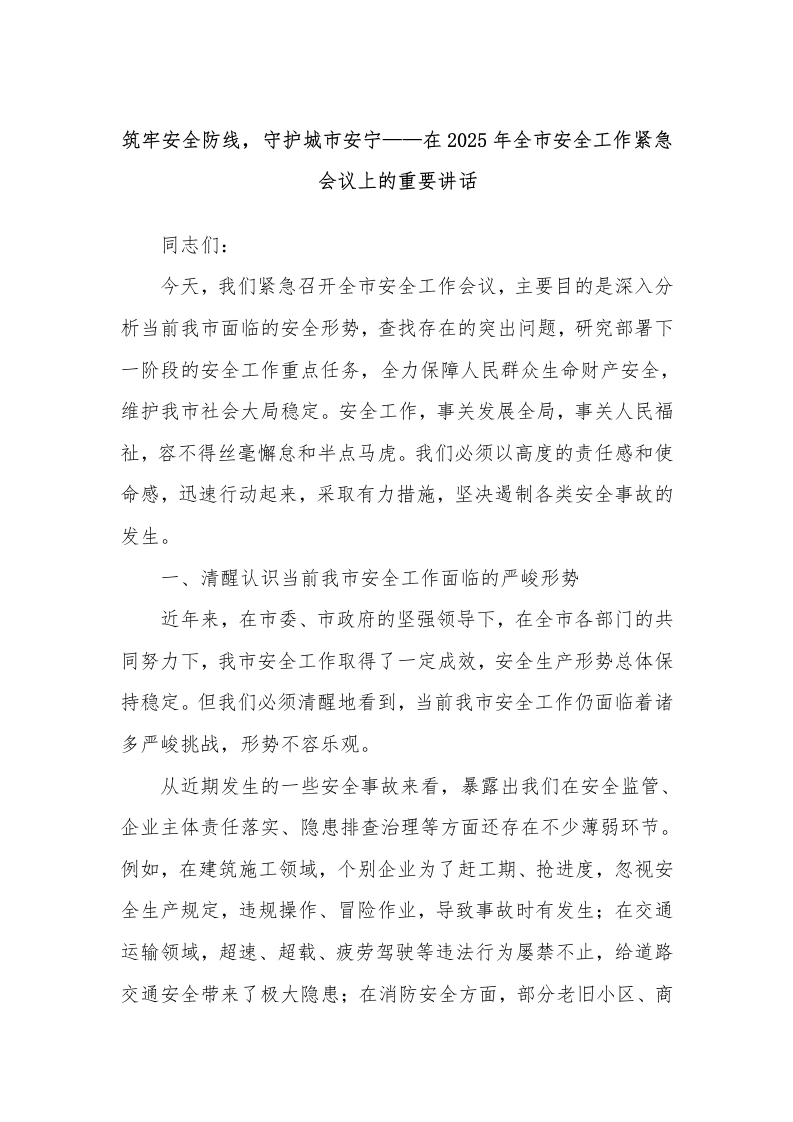 筑牢安全防线,守护城市安宁——在2025年全市安全工作紧急会议上的重要讲话