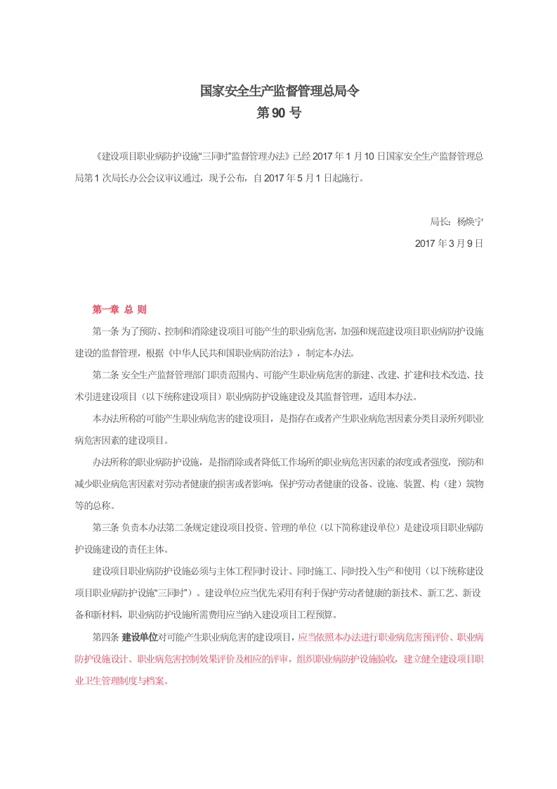 国家安监总局令[2017]第90号_《建设项目职业病防护设施“三同时”监督管理办法》