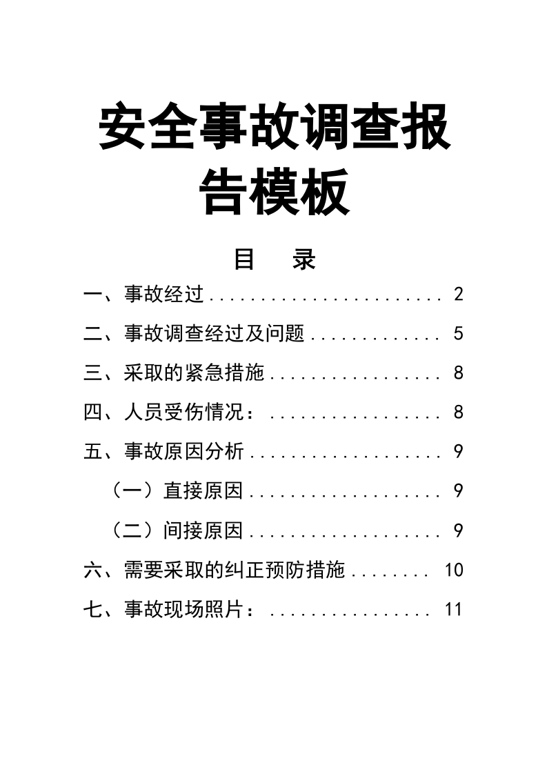 安全事故调查报告模板目录一、事故经过2二、事故调查经过及问题5三、采取的紧急措施.....8四、人员受伤情况:8五、事故原因分析9(一)直接原因9(二)间接原因.9六、需要采取的纠正预防措施...·10七、事故现场照片:11