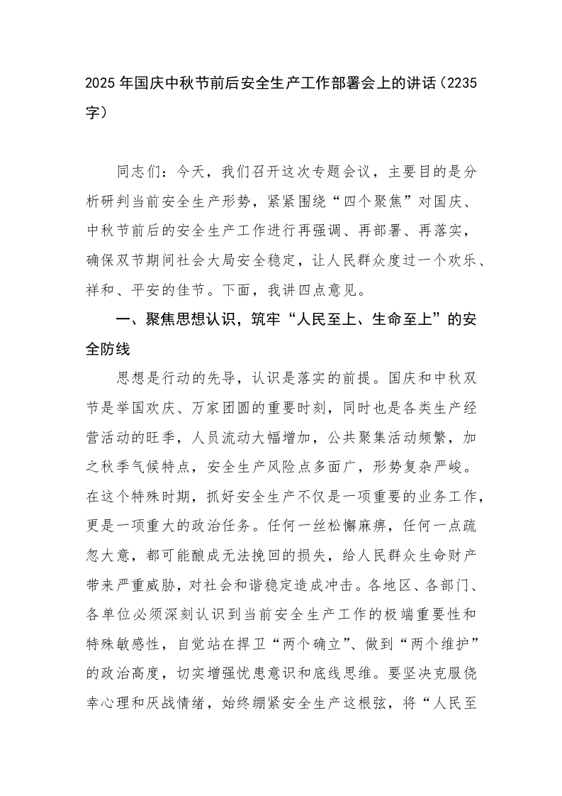 2025年国庆中秋节前后安全生产工作部署会上的讲话(2235字)