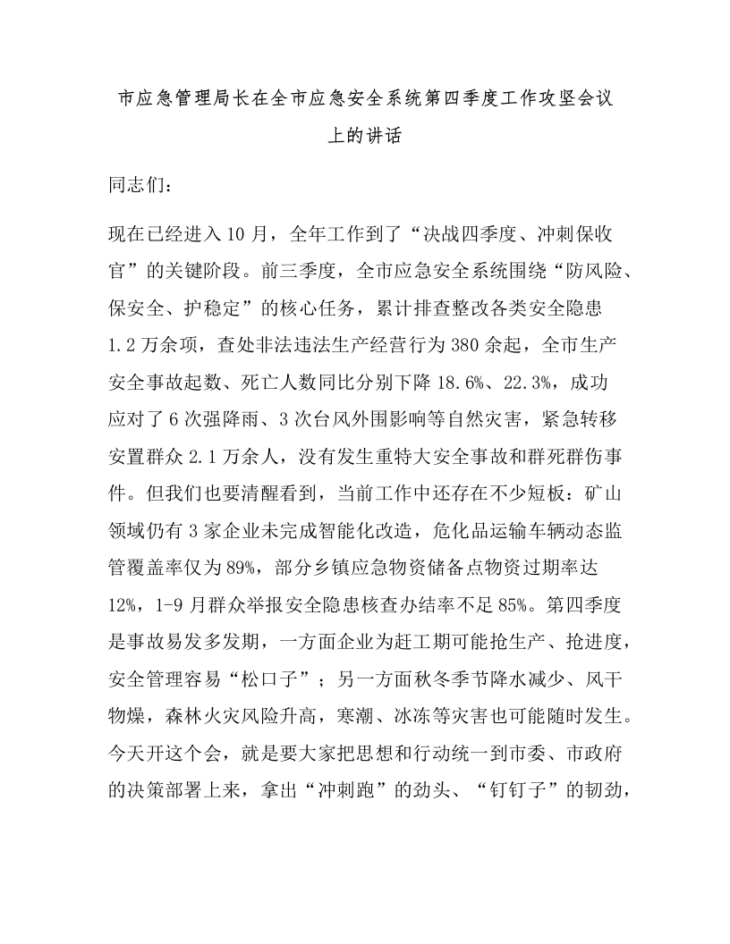 市应急管理局长在全市应急安全系统第四季度工作攻坚会议上的讲话