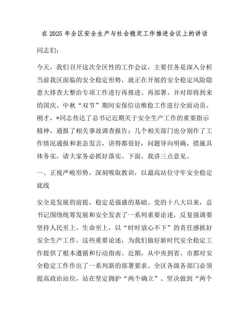 在2025年全区安全生产与社会稳定工作推进会议上的讲话