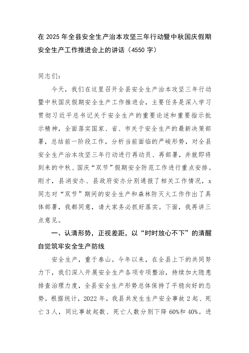 在2025年全县安全生产治本攻坚三年行动暨中秋国庆假期安全生产工作推进会上的讲话(4550字)