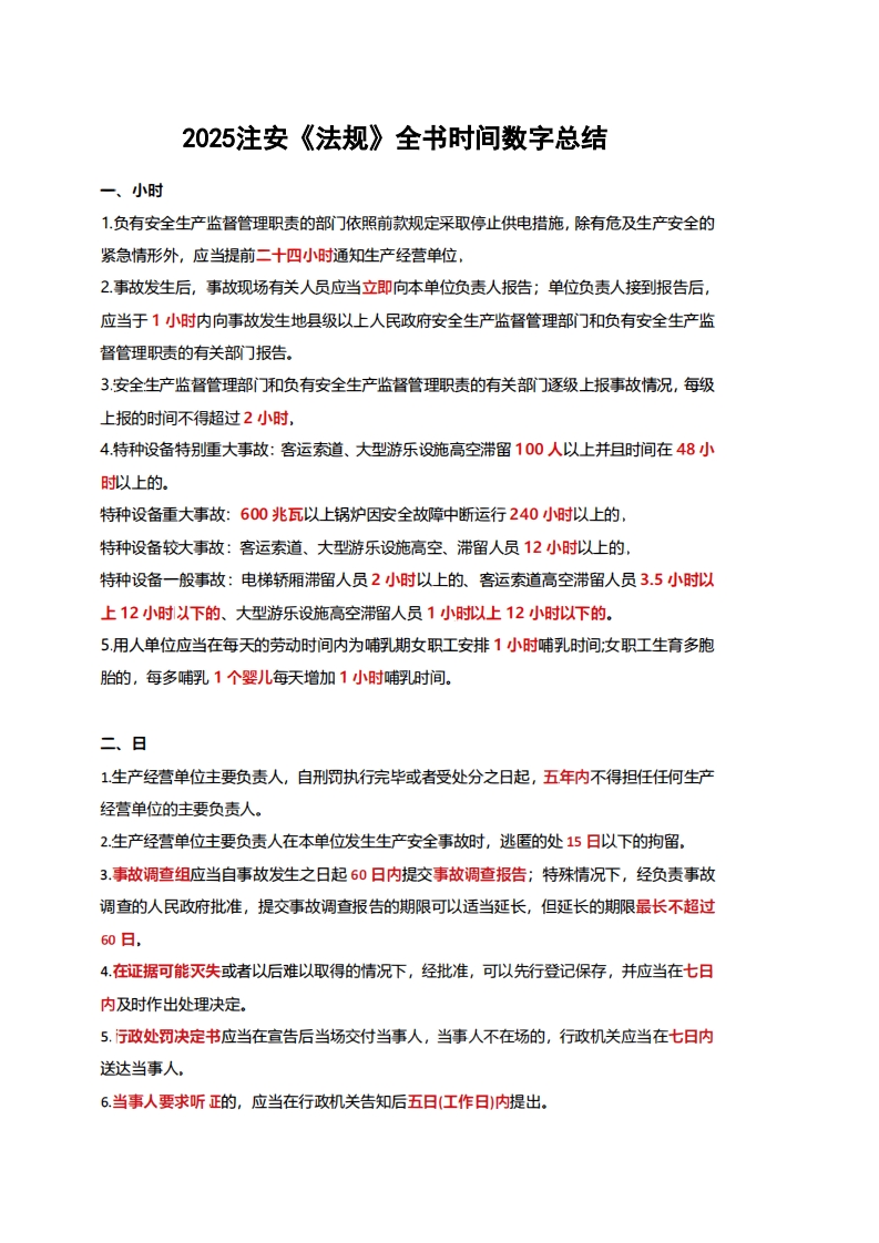 【文件】2025注安时间数字考点【归纳对比记忆】
