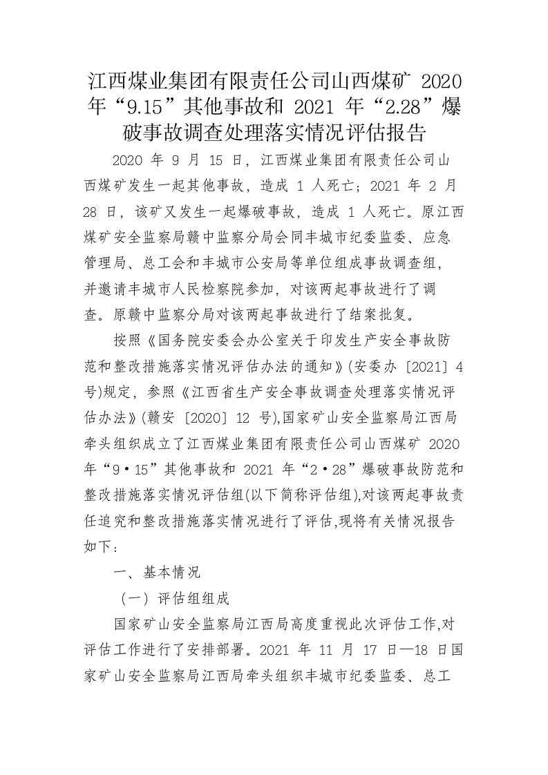 江西煤业集团有限责任公司山西煤矿2020年9.15其他事故和2021年2.28爆破事故调查处理落实情况评估报告