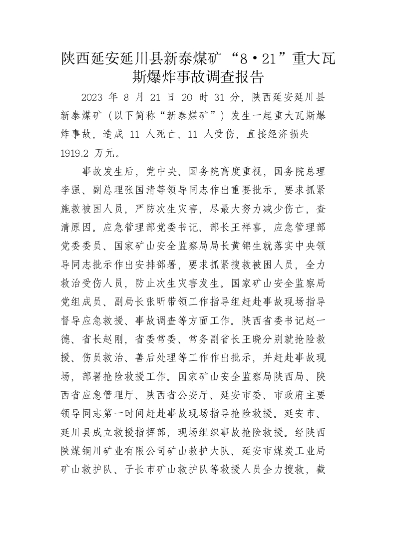 陕西延安延川县新泰煤矿821重大瓦斯爆炸事故调查报告