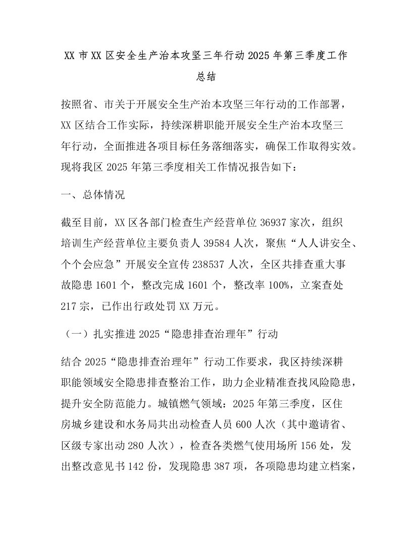 XX市XX区安全生产治本攻坚三年行动2025年第三季度工作总结