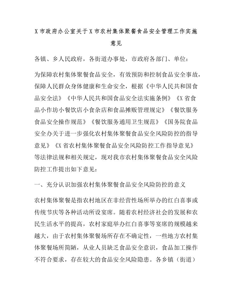 X市政府办公室关于X市农村集体聚餐食品安全管理工作实施意见