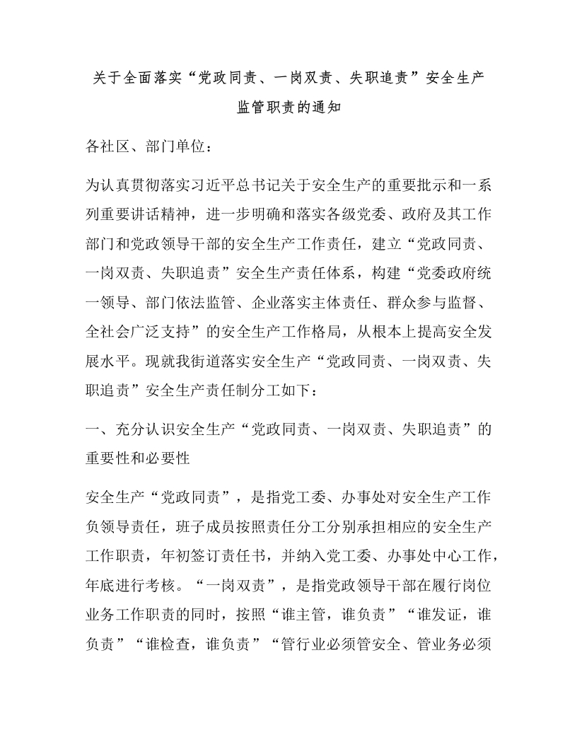 关于全面落实“党政同责、一岗双责、失职追责”安全生产监管职责的通知