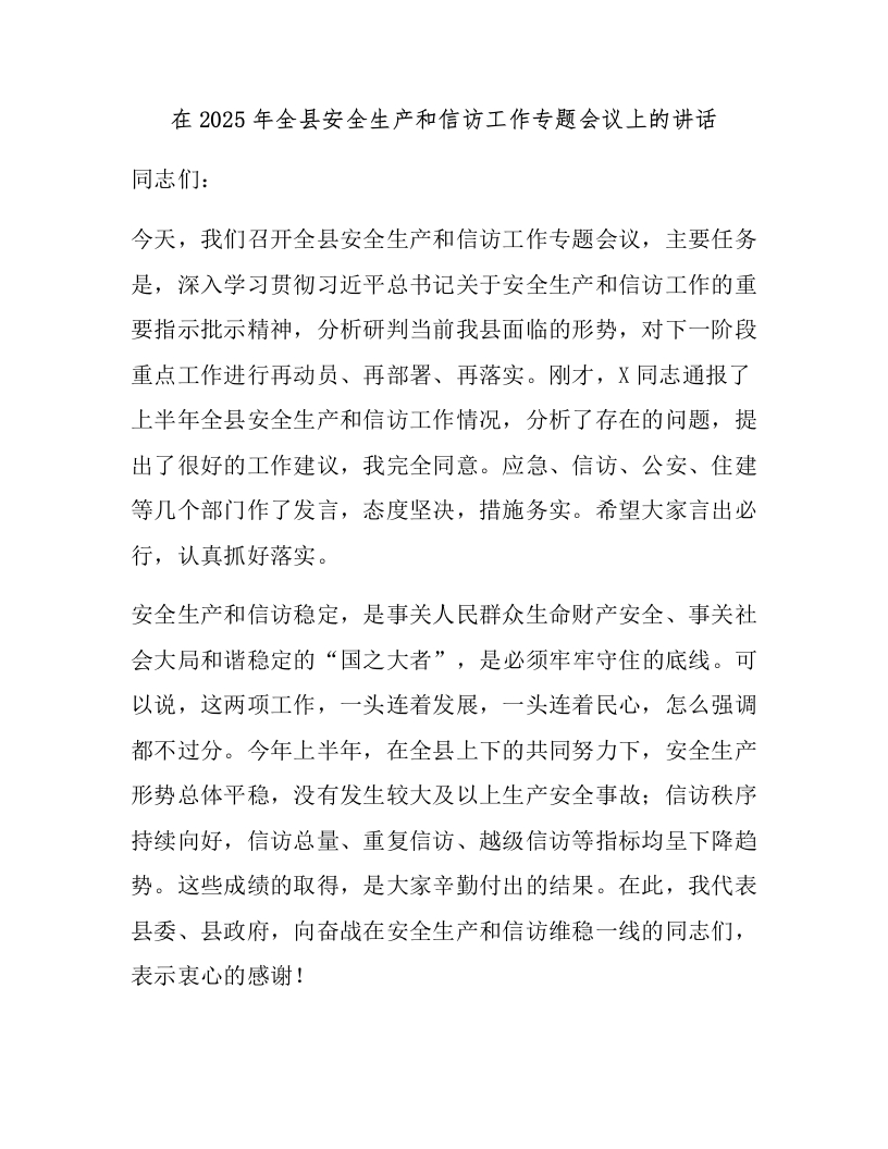 在2025年全县安全生产和信访工作专题会议上的讲话