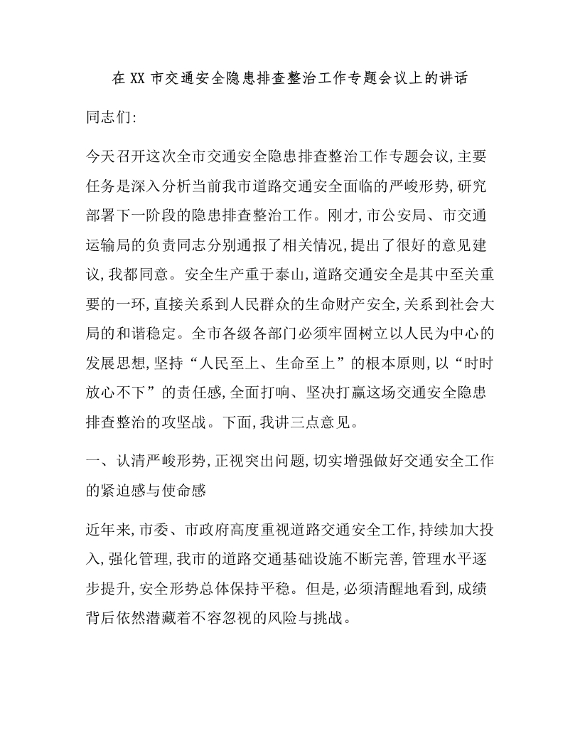 在XX市交通安全隐患排查整治工作专题会议上的讲话