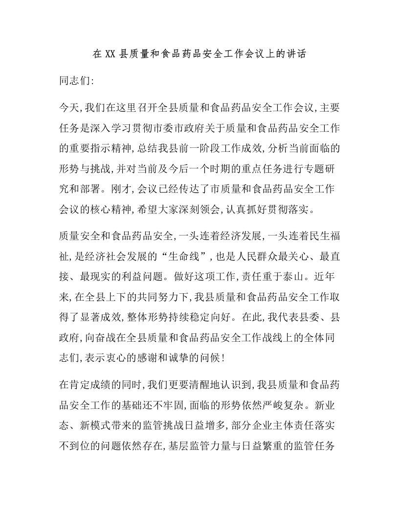 首页安全文档综合在XX县质量和食品药品安全工作会议上的讲话