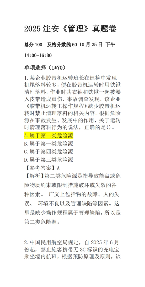 首页安全题库注安考试2025注安《管理》真题及参考答案