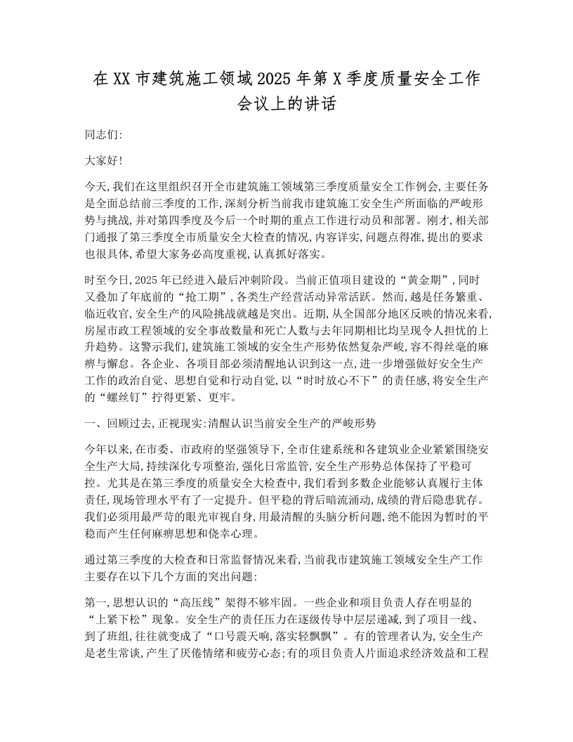在XX市建筑施工领域2025年第X季度质量安全工作会议上的讲话