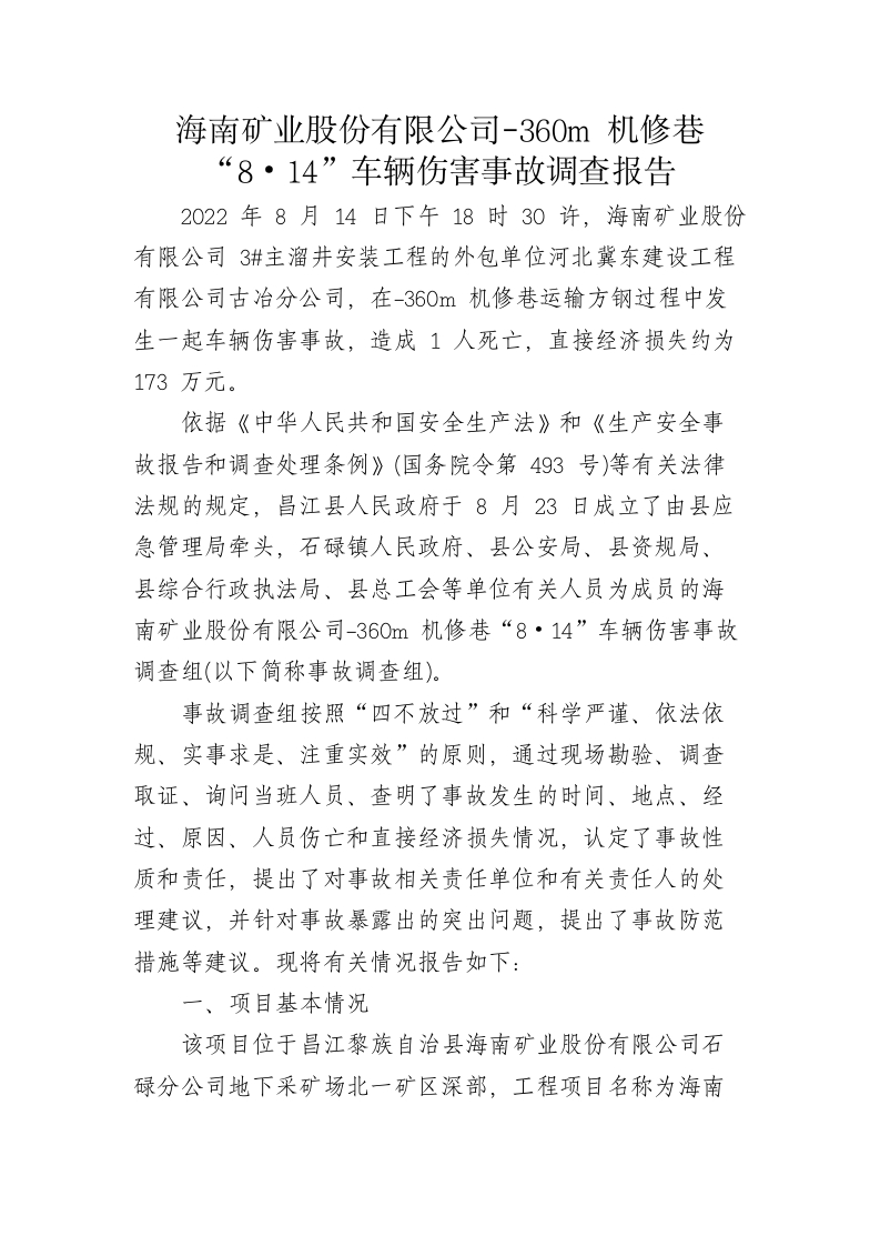 海南矿业股份有限公司-360m机修巷814车辆伤害事故调查报告