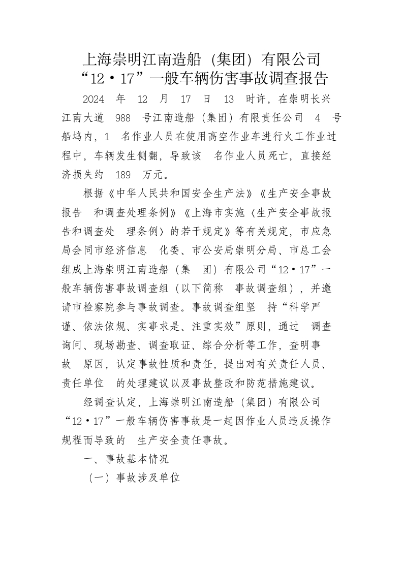 上海崇明江南造船集团有限公司1217一般车辆伤害事故调查报告
