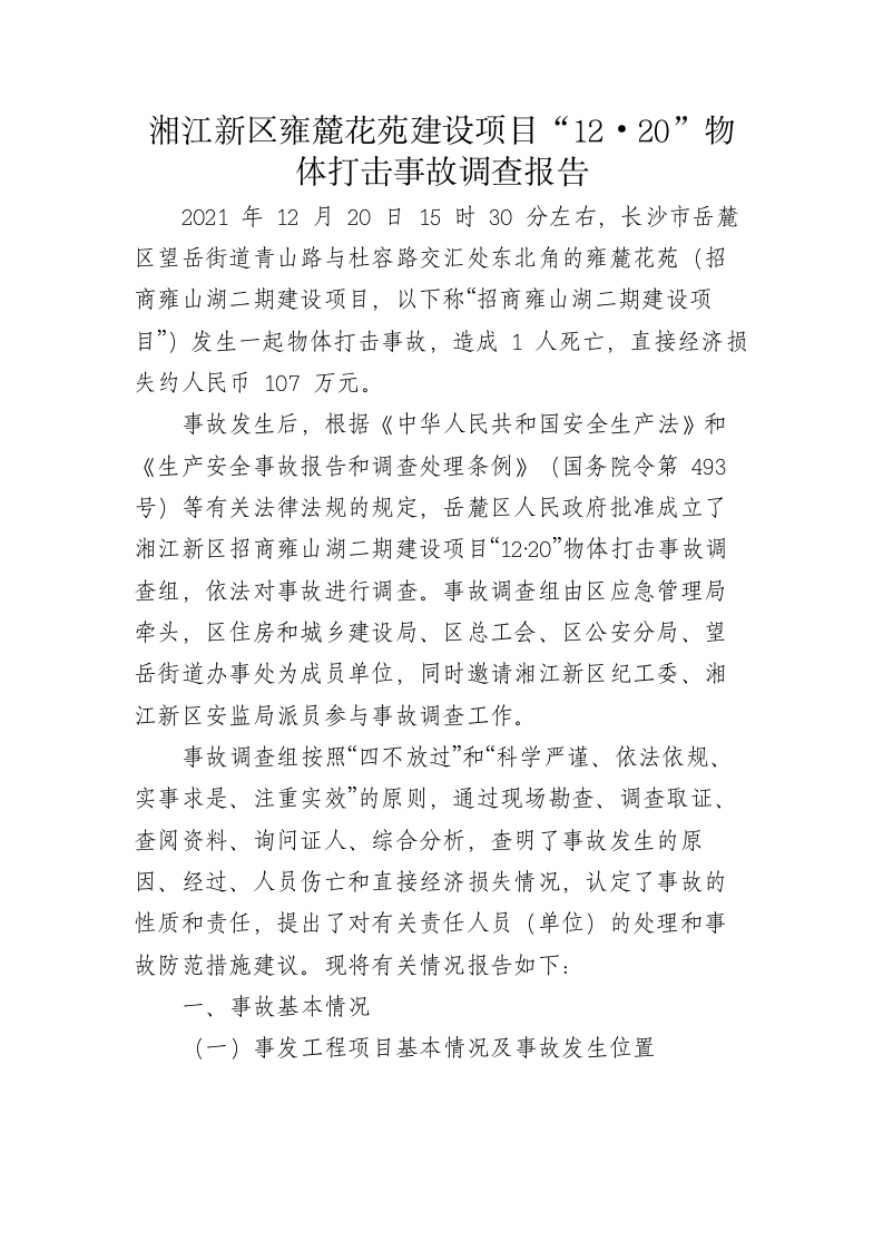 湘江新区雍麓花苑建设项目1220物体打击事故调查报告