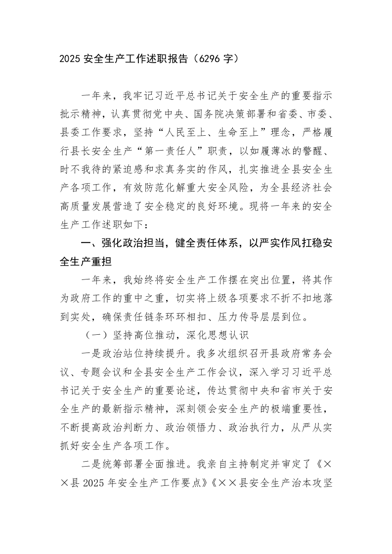 2025安全生产工作述职报告(6296字)