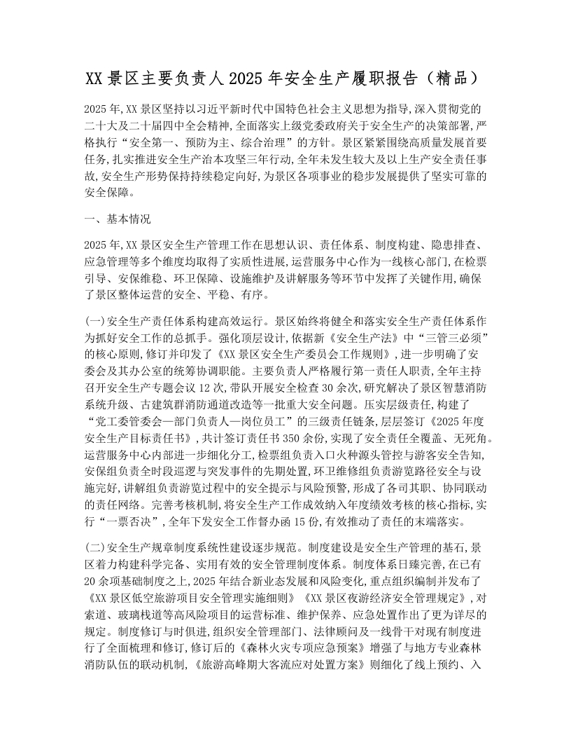 首页安全文档综合XX景区主要负责人2025年安全生产履职报告(精品)