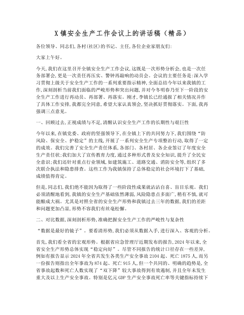 X镇安全生产工作会议上的讲话稿(精品)