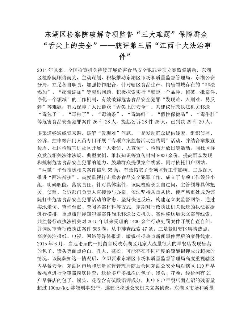 东湖区检察院破解专项监督“三大难题”保障群众“舌尖上的安全”——获评第三届“江西十大法治事件”